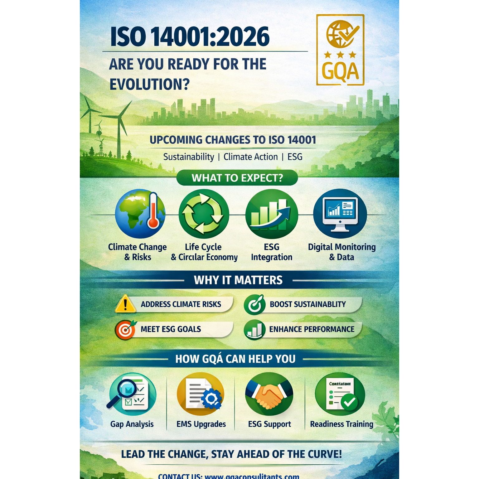 🌱 ISO 14001 is Evolving – Are You Ready for 2026 ? The environmental management landscape is changing—and so is the globally recognized **ISO 14001 standard**. The upcoming **ISO 14001:2026 revision** is expected to bring significant enhancements, aligning organizations with modern sustainability, climate action, and ESG expectations. At **GQA Consultants Pvt. Ltd.**, we are closely tracking these developments to help our clients stay ahead of compliance and lead in sustainability. 🔍 **What Changes to Expect ?** 🌍 Stronger focus on **climate change & environmental risks** ♻️ Enhanced **life cycle thinking & circular economy approach** 📊 Integration with **ESG (Environmental, Social, Governance) frameworks** 📡 Increased emphasis on **digital monitoring & environmental data** 🤝 Greater focus on **stakeholder expectations & transparency** ⚠️ **Why This Matters** Organizations will need to: ✔ Re-evaluate environmental risks (including climate impact) ✔ Strengthen sustainability strategies ✔ Improve environmental performance tracking ✔ Align with global ESG expectations 🚀 **How GQA Can Support You** We are ready to support your transition with: ✅ Gap assessments for ISO 14001:2026 ✅ EMS upgrades & documentation ✅ ESG integration support ✅ Internal auditor & awareness training ✅ Certification readiness programs 💡 Don’t wait for the transition deadline—start preparing now and turn compliance into a competitive advantage. 📩 Get in touch with **GQA Consultants Pvt. Ltd.** today to begin your ISO 14001:2026 readiness journey. #ISO14001 #Sustainability #ESG #EnvironmentalManagement #ISOStandards #ClimateAction #GQAConsultants