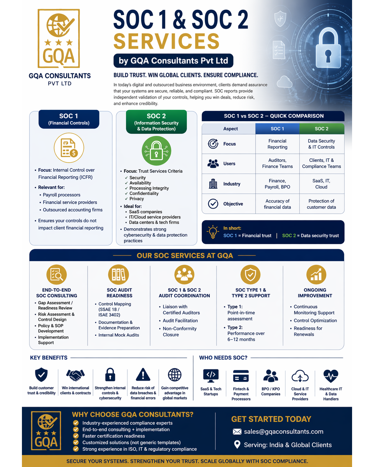 π Build Trust. Win Global Clients. Ensure Compliance. In todayβs digital and outsourced business environment, clients demand assurance that your systems are secure, reliable, and compliant. SOC reports provide independent validation of your controls, helping you win deals, reduce risk, and enhance credibility.π What is SOC 1 & SOC 2? πΉ SOC 1 (Financial Controls) Focus: Internal Control over Financial Reporting (ICFR) Relevant for: Payroll processors Financial service providers Outsourced accounting firms Ensures your controls do not impact client financial reporting πΉ SOC 2 (Information Security & Data Protection) Focus: Trust Services Criteria Security Availability Processing Integrity Confidentiality Privacy Ideal for: SaaS companies IT/Cloud service providers Data centers & tech firms Demonstrates strong cybersecurity & data protection practices π οΈ Our SOC Services at GQA β End-to-End SOC Consulting Gap Assessment / Readiness Review Risk Assessment & Control Design Policy & SOP Development Implementation Support β SOC Audit Readiness Control Mapping (SSAE 18 / ISAE 3402) Documentation & Evidence Preparation Internal Mock Audits β SOC 1 & SOC 2 Audit Coordination Liaison with Certified Auditors Audit Facilitation Non-Conformity Closure β SOC Type 1 & Type 2 Support Type 1: Point-in-time assessment Type 2: Performance over 6β12 months π― Key Benefits β Build customer trust & credibility β Win international clients & contracts β Strengthen internal controls & cybersecurity β Reduce risk of data breaches & financial errors β Gain competitive advantage in global markets π’ Who Needs SOC? SaaS & Tech Startups Fintech & Payment Processors BPO / KPO Companies Cloud & IT Service Providers Healthcare IT & Data Handlers πΌ Why Choose GQA Consultants? β Industry-experienced compliance experts β End-to-end consulting + implementation β Faster certification readiness β Customized solutions (not generic templates) β Strong experience in ISO, IT & regulatory compliance π Get Started Today π§ Email: sales@gqaconsultants.com π Serving: India & Global Clients